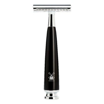 Der MÜHLE RYTMO Rasierhobel, geschlossener Kamm, mit einem Griff aus schwarzem Edelharz.